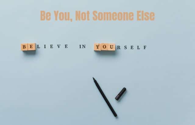 Answer: “Be You, Not Someone Else” encourages authenticity and embracing your unique qualities rather than imitating others.